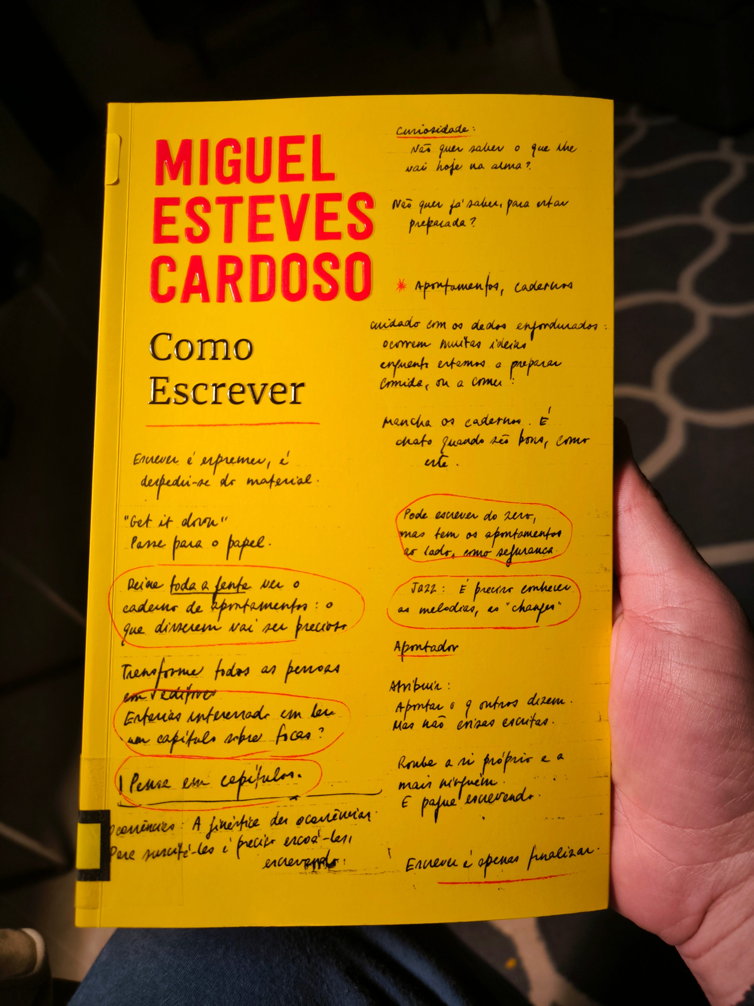 Li o mais recente livro do Miguel Esteves Cardoso, Como Escrever. Adorei-o, do princípio ao fim, repleto de lugares-comuns cheios de humor, sobre escrever, sobre processos, sobre a importância da palavra escrita. Gosto dos livros que me fazem rir no silêncio da leitura. Voltei a ser lembrado que podemos ser divertidos a falar de coisas sérias, sem perder a seriedade e utilizando algum humor como apontamento estilístico que pode reforçar ideias. Só tive pena de, sendo da biblioteca aqui do burgo, não ter podido seguir um dos conselhos iniciais: anotá-lo nas amplas margens. Teria ficado cheio de rabiscos, como eu gosto. E ainda para mais, tornar-me-ia num leitor-escritor enquanto o fazia. Mas o Miguel explica isso bem melhor do que eu.